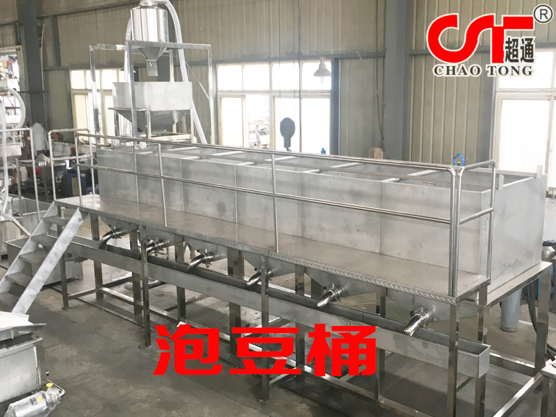 生產(chǎn)流程 :將黃豆送入泡豆槽中加水浸泡,通過(guò)一定時(shí)間的浸泡使豆粒吸水膨脹,有利于黃豆磨制粉碎后充分提取其中的蛋白質(zhì)。 根據(jù)氣溫變化,黃豆質(zhì)量,生產(chǎn)速度準(zhǔn)確掌握浸豆時(shí)間。一般春、秋季氣溫在10-12℃,浸泡時(shí)間12-15小時(shí);夏季氣溫在28-33℃,浸泡5-7小時(shí),冬季氣溫在15-22小時(shí),夏季泡豆至八成熟,掰開(kāi)豆瓣中心稍有凹形,中間色澤較暗,冬季可泡到九成熟,掰開(kāi)豆瓣成乳白色,中心淺黃色,PH值為中性。 可選配自動(dòng)浸泡系統(tǒng):為了提高產(chǎn)品質(zhì)量和得率,用現(xiàn)代化的科技手段,對(duì)傳統(tǒng)工藝進(jìn)一步完善,使黃豆能在浸泡后的時(shí)間里進(jìn)行磨碎、燒煮,同時(shí)也減少人力,減輕工人勞作強(qiáng)度,減少人為地隨意性,便于廠方制定規(guī)范化操作要求,保證成品的質(zhì)量品質(zhì) 1、黃豆由儲(chǔ)料倉(cāng)經(jīng)電控閥放入稱料桶計(jì)量 2、稱量桶(小車(chē))由電機(jī)驅(qū)動(dòng)達(dá)每個(gè)浸泡桶自動(dòng)放豆,可多次重復(fù)、計(jì)量設(shè)定。 3、浸泡桶設(shè)自動(dòng)程序進(jìn)水、放水,水位限止。根據(jù)客戶不同要求加設(shè)沖氣翻滾,黃豆多次過(guò)水沖洗。自動(dòng)放豆、溫水浸泡等。 4、放水指,浸泡好的黃豆水應(yīng)放掉后,再加如清潔的水沖洗,然后連水帶豆進(jìn)入淌槽,去石、去鐵,再次瀝水后磨漿。